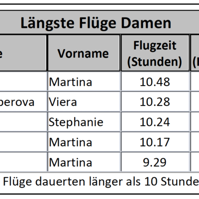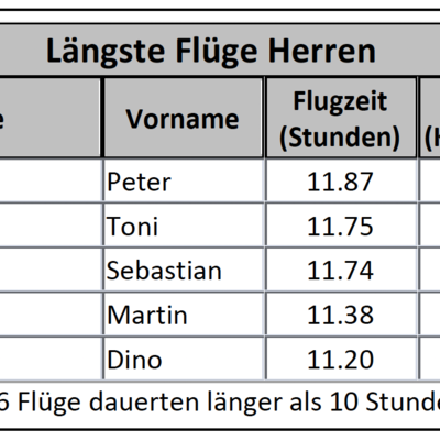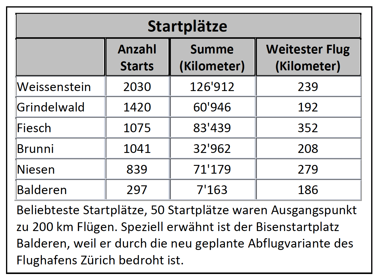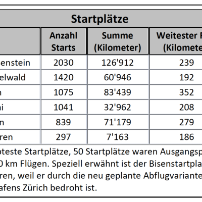 Am meisten 200 km-Flüge glückten am 10. Mai, es waren 43 an der Zahl. Total ergaben 372 Flüge 32'840 km, wovon 23'622 km auf Flüge über 100 km entfielen. Der weiteste Gleitschirm-Flug, ein 272 km grosses FAI-Dreieck, realisierte Dominic Rohner in Graubünden.