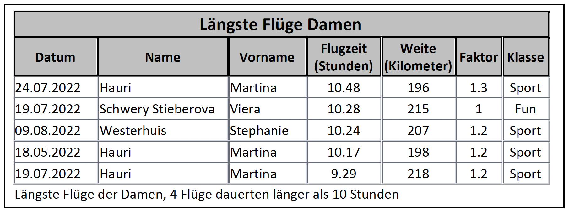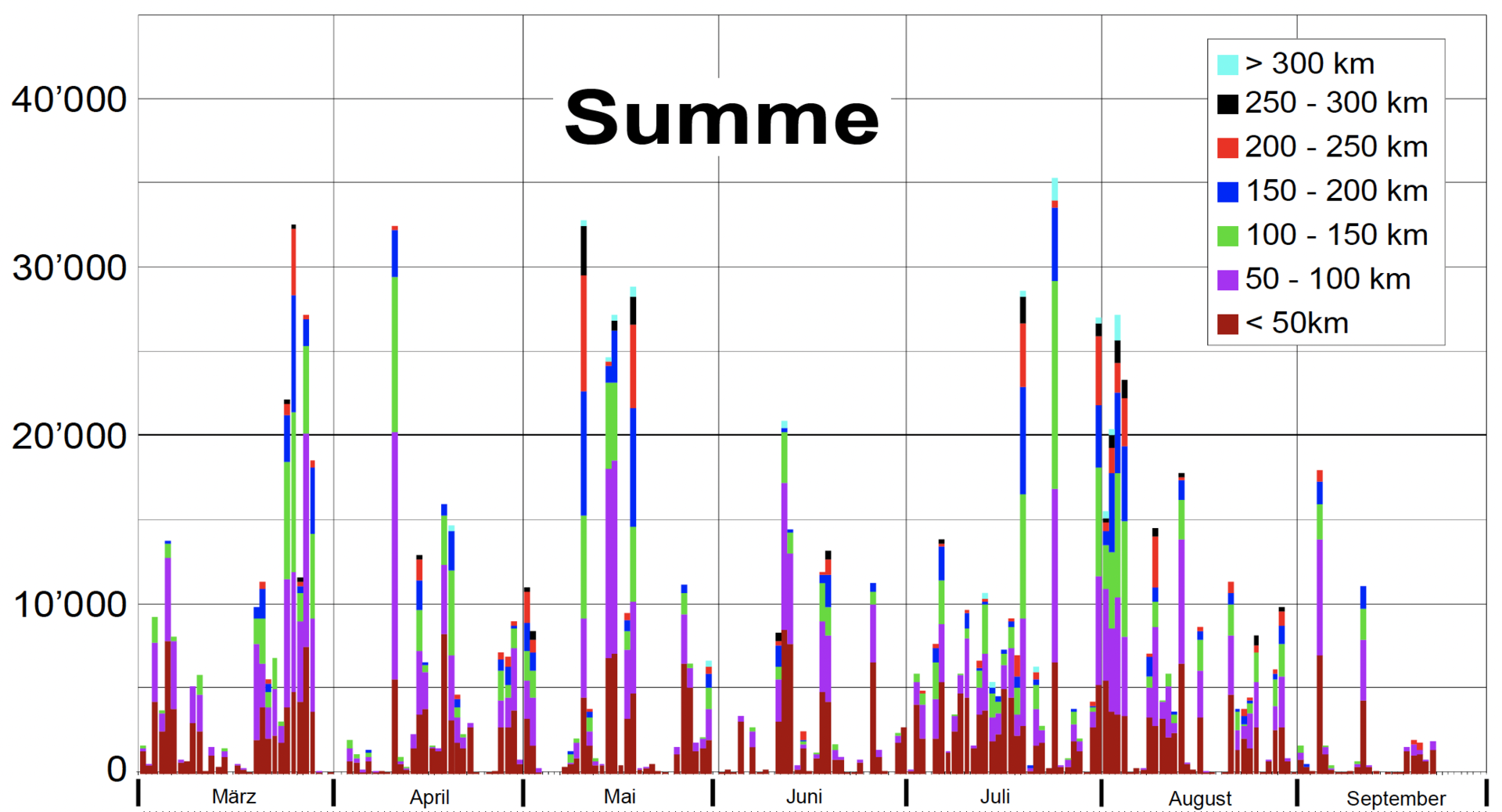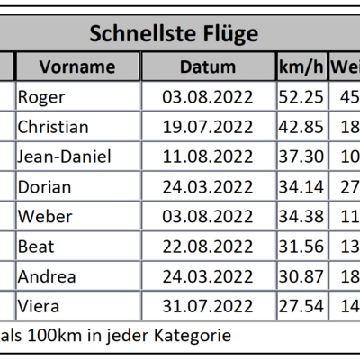 Bei der Traumsaison 2022 fällt auf, dass die Supertage mit Tagessummen über 40'000 km fehlen. Es scheint, dass die Wetterprognosen jeweils eine Auswahl an guten Flugtagen anboten, sodass sich der Flugbetrieb auf verschiedene Tage verteilte. An vier Tagen kletterte die Summe über 30'000 km. Einerseits trieb die Anzahl der Flüge die Summe in die Höhe und anderseits die Weite der Flüge. Ist der Beitrag der weiten Flüge gross, charakterisiert das Tage, an welchen nicht nur den Profis weite Flüge gelingen, sondern auch den talentierten Genusspiloten.