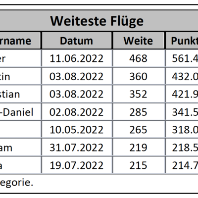 Am 15. Mai stellte Sebastian Benz mit 345 km gerader Strecke einen neuen CCC-Rekord auf. Von der Riederalp flog er Richtung Osten bis nach Mühlbach im österreichischen Pinzgau. Er überbot damit den bisherigen Rekord von Marcel Schmid vom 22. Juni 2017 um wenige Kilometer. Doch sein Rekord sollte nicht lange halten, denn Martin Muller gelang in den französischen Alpen am 3. August ein flaches Dreieck von 360 km Grösse. Beide Piloten waren mehr als 11 Stunden und im Durchschnitt mit über 31 km/h unterwegs. In der Kategorie Starrflügler konnte Christian Voiblet den Rekord gleich zweimal auf schliesslich 352 km verbessern. 2022 waren weite Flüge keine Seltenheit: 10 Piloten gelangen 23 Flüge über 300 km. Zudem flogen 5 Pilotinnen und 140 Piloten an 59 Tagen 325 Mal weiter als 200 km. Nicht nur die Spitzenpiloten reüssierten, 59 Fliegerinnen und 761 Fliegern glückten nämlich persönliche Rekorde, darunter flogen 8 Pilotinnen und 107 Piloten erstmals weiter als 100 km, sowie 4 Pilotinnen und 40 Piloten erstmals weiter als 200 km. Manchmal zählen für einen persönlichen Rekord auch ein neues Gebiet, die Umgebung, das Licht und die Wolken. Calina Pletosu beschreibt dies in ihrem persönlichen Rekordflug am 31. Juli treffend: "Magnifique vol depuis le Niesen! Ce fut une balade chargée en paysages, souvenirs, beaux nuages, belle lumière et conditions agréables."
